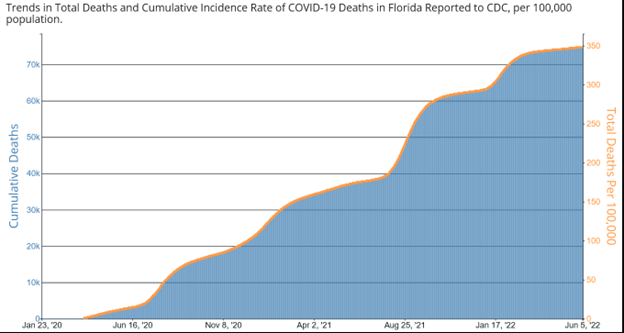 - As of 6-2-22, FL has reported 74,590 Covid deaths among permanent residents.