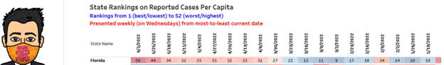 - On 6-1-22, Florida’s state rank for confirmed cases was the third worst in the US.