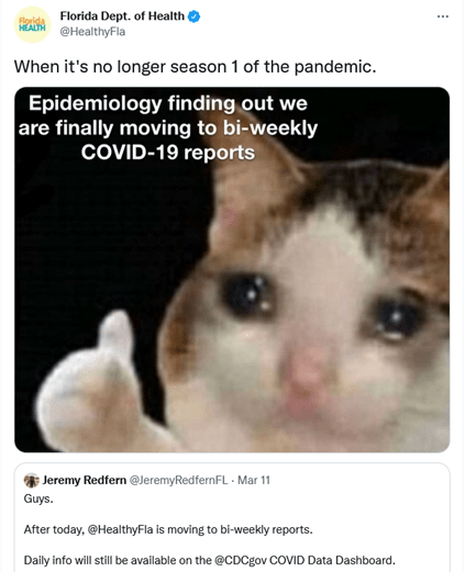 I heartily disagree with this official announcement made from the Florida Department of Health retweeting their spokesman’s personal Twitter account on March 11th. We need more information, not less.