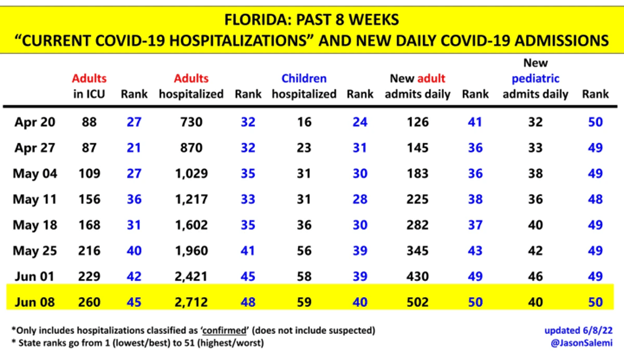 On June 2nd, Florida was the 6th worst overall for inpatients. Adult and pediatric admissions were 2nd and 3rd worst respectively:
