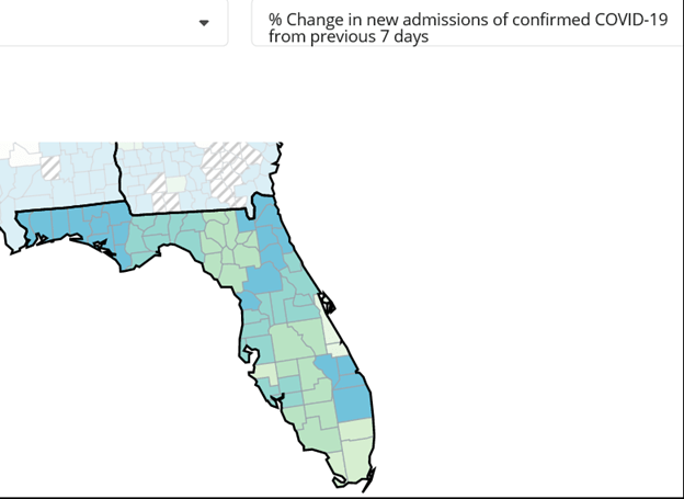 For example, Miami-Dade has had 513 new hospital admissions in the last 7 days (5% drop), Palm Beach had 302 (31% rise), (Broward has had 369 (5% decline), and Hillsborough has had 275 (17% more):