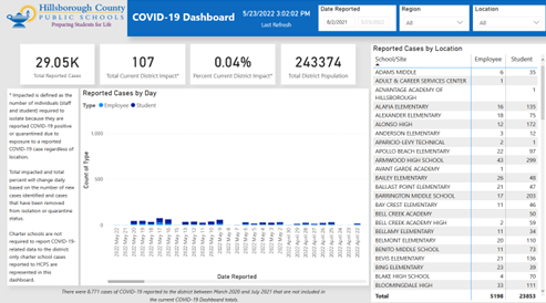 - During the 2021–2022 school year, the Hillsborough County School District reported 29,000 cases among students and personnel.