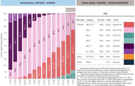 Since my last report on May 19th, the CDC has begun calculating the percentages of BA.4 (5%) and BA.5 (8%). BA.1 has been completely replaced: