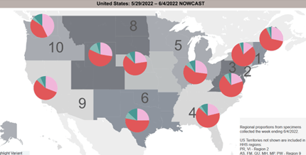 In this map, pink shows the amount of omicron BA.2 and red represents BA.2.12.1. Light green designates BA.4 and dark green depicts BA.5.