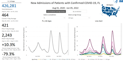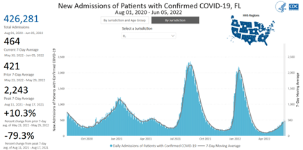 For August 1, 2020–June 2, 2022, Florida has had 424,902 new hospital admissions for Covid patients. This represents 8.9% of all Covid admissions for 6.6% of the US population.