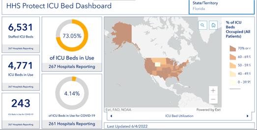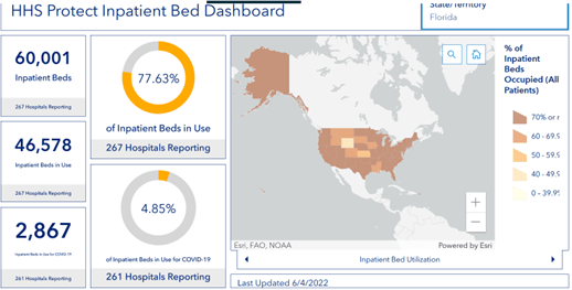On the morning of June 4, 2022, 78% of hospital beds in Florida were full. Covid patients accounted for 2,867 of them (4.8% of utilized beds).
