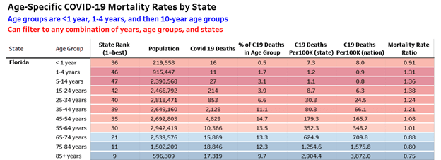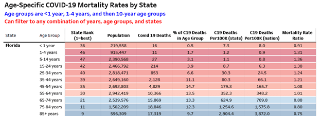 Florida children aged 1–4 have a death rate 31% worse than the national average, making the state fifth worst in the US, with 11 deaths. Sixteen permanent Florida residents under 1 year old have died. On June 26th, there were 76 Florida children hospitalized with Covid.