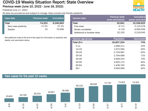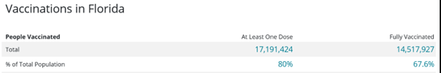 - As of June 16th, Florida claimed a 74% vaccination rate. This includes anyone with at least one shot, over 600,000 snowbirds, and “vaccine tourists.” It excludes children under 5.
