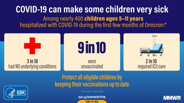 - During May 2022, unvaccinated children aged 5–11 were 70% more likely to need hospital admission than their vaccinated peers. Unvaccinated teens aged 12–17 were 31% more likely. Hospitalization rates doubled for ages 5–11 and tripled for teens since April.