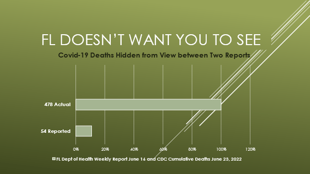 - On 6-6-22, a report from the Florida Auditor General revealed the state omitted 3,000 Covid deaths from official reporting during March–October 2020. They are still not reflected in the Cumulative Deaths.