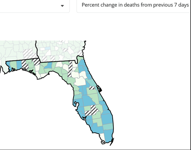 - Miami-Dade reported 59 deaths in the last week (up 127%); Palm Beach, 53 (up 212%); Broward, 32 (up 23%); and Hillsborough, 23 (up 77%).