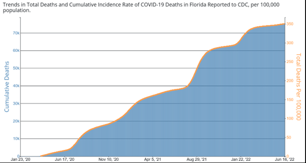 - As of 6-23-22, the state has reported 75,574 Covid deaths among permanent FL residents to the CDC.