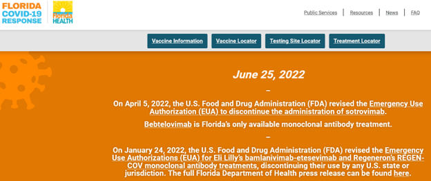 Governor DeSantis accused the Biden Administration of having no clinical evidence, despite the manufacturers of both antibodies noting they are now ineffective: