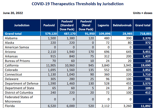 As of June 19th, Florida patients had used 42% of the state’s cumulative Paxlovid deliveries; 8% of the Legevrio (Molnupir); 31% of the Bebtelovimab; and 29% of the Evusheld: