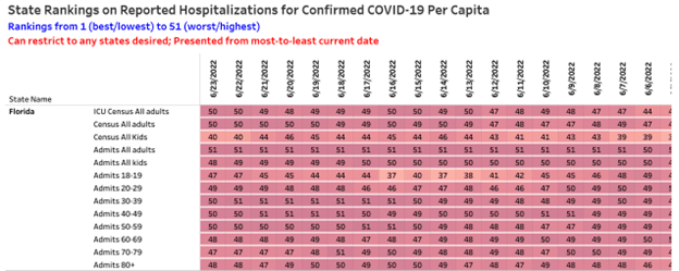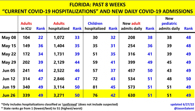 On June 23rd, Florida was the worst in the nation for adult Covid admissions, 2nd worst for adult hospitalizations; 2nd worst for adult ICU patients, 4th worst for pediatric admissions; and 11th for pediatric hospitalizations: