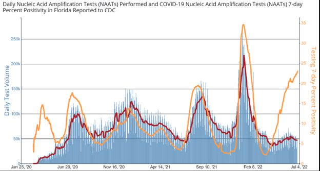 In the region which includes Florida during June 20–25, 2022, the percentage of BA.2 fell to 5%; BA.2.12.1 declined to 43%; BA.4 rose to 14%; and BA.5 climbed to 39%: