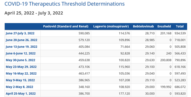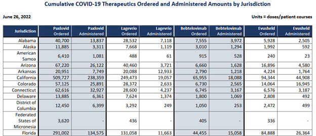 As of June 26th, Florida patients had used 46% of the state’s cumulative Paxlovid deliveries; 9% of the Legevrio (Molnupir); 34% of the Bebtelovimab; and 31% of the Evusheld: