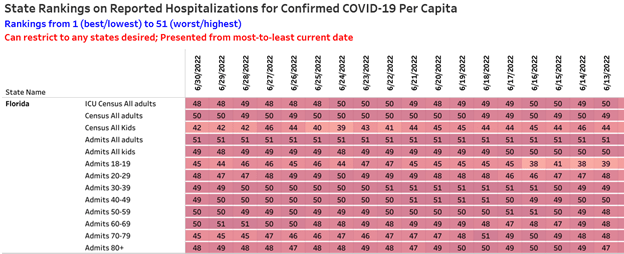 This week, Florida ranks between 3rd and 5th worst in Covid deaths; worst in adult hospital admissions, 2nd in adult hospitalization; 4th in adult ICU Covid patients; 3rd in pediatric hospital admissions; and 10th in pediatric hospitalizations.