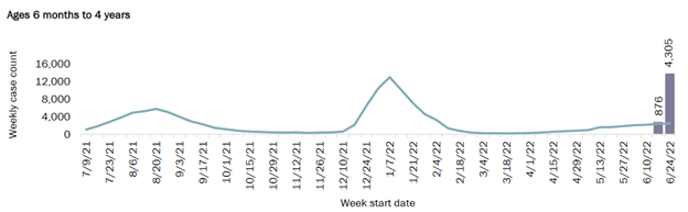 Pediatric Covid hospitalizations are 4% higher on June 30th than a week earlier, with 75 children in the hospital.