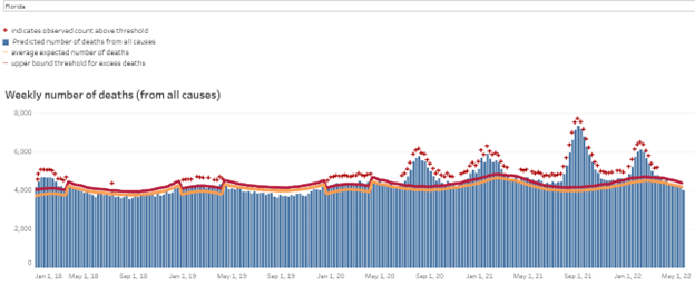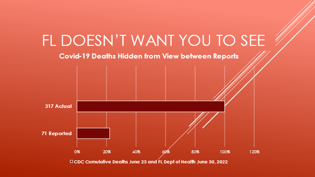 - On 6-6-22, a report from the Florida Auditor General revealed the state omitted 3,000 Covid deaths from official reporting during March–October 2020. They are still not reflected in the Cumulative Deaths.