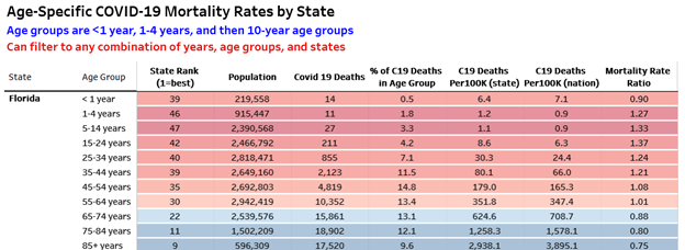 - Children aged 5–14 are in the worst ranking demographic at 5th. Without small states with one death, FL is 3rd worst. There have been 38% more Covid deaths in that age group than the national average.