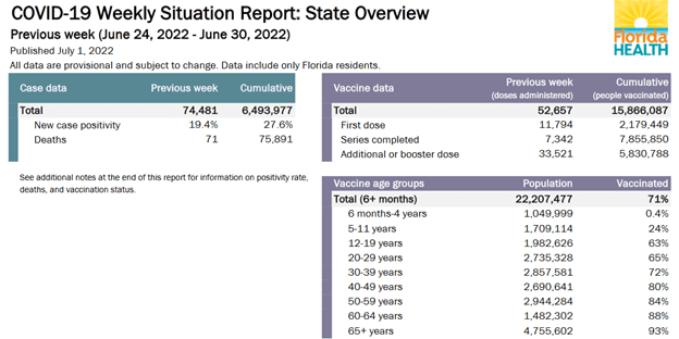 - As of 6-30-22, the state has reported 75,891 Covid deaths among permanent FL residents to the CDC.
