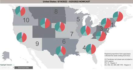On June 25, 2022, 93% of sequenced samples in the US and 95% in the region which includes Florida were BA.2.12.1, BA.4, or BA.5.