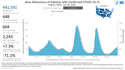 For August 1, 2020–June 30, 2022, Florida has had 441,391 new hospital admissions for Covid patients. This represents 9.0% of all Covid admissions for 6.6% of the US population.