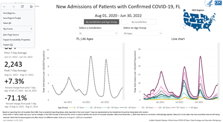 Nevertheless, that was 71% fewer compared to the peak during August 11–17, 2021, when there were 10.42 admissions/100,000 Floridians: