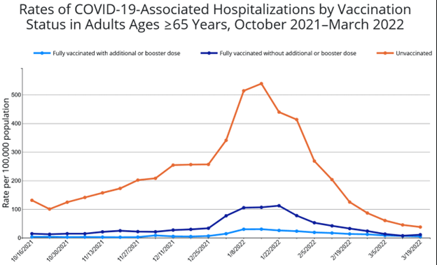 - During March 12–19, 2022, boosters prevented 55% of omicron hospitalizations among people aged 18–49; 72% for ages 50–64; and 87% for senior citizens.