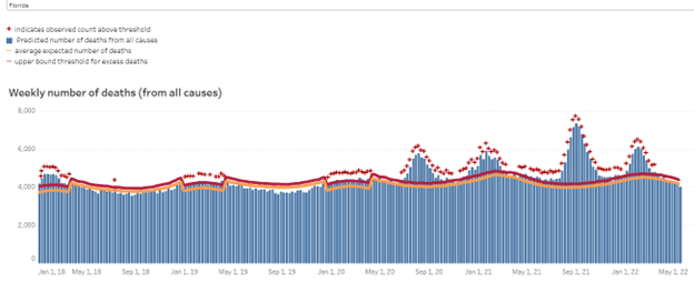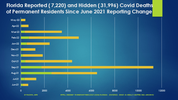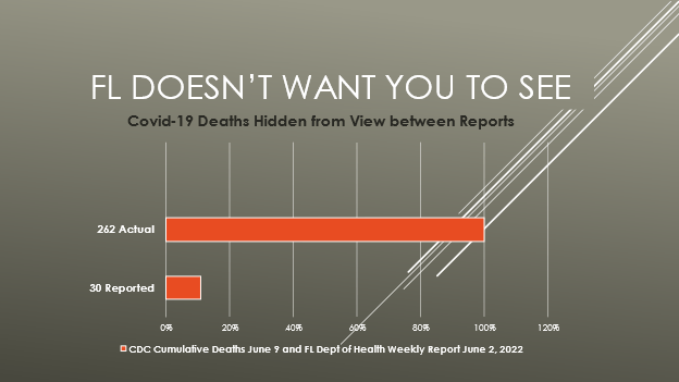 - On 6-6-22, a report from the Florida Auditor General revealed the state omitted 3,000 Covid deaths from official reporting during March–October 2020.