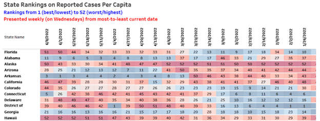 - On 6-1-22, Florida’s state rank for confirmed cases was the 2nd worst in the US.