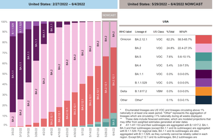 In late May 2022, the CDC began calculating the percentages of BA.4 (5%) and BA.5 (8%). BA.1 has been completely replaced: