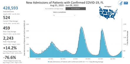 For August 1, 2020–June 9, 2022, Florida has had 428,593 new hospital admissions for Covid patients. This represents 9.0% of all Covid admissions for 6.6% of the US population.