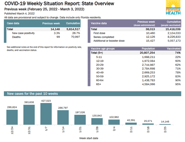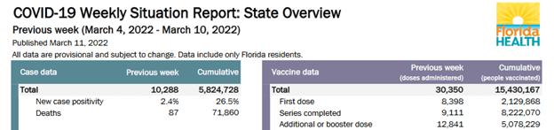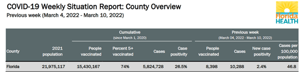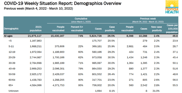 - On the March 10th report, Florida reported 5,824,728 cumulative cases among permanent residents.