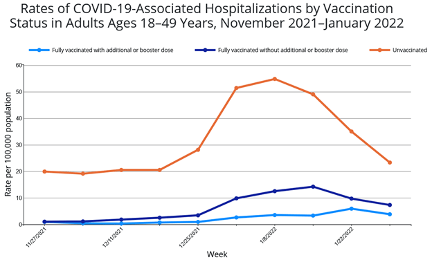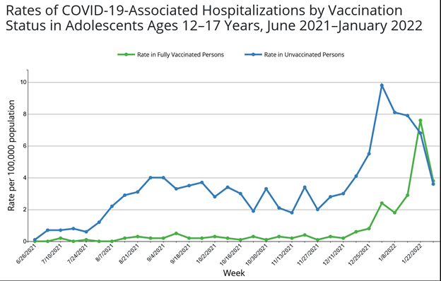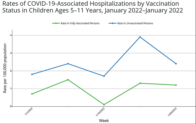 During the omicron wave, unvaccinated children 5–11 were 2–3 times as likely to need hospitalization. A drop from hospitalization 4 times as likely in unvaccinated children aged 12–17 to almost even shows their need for boosters.