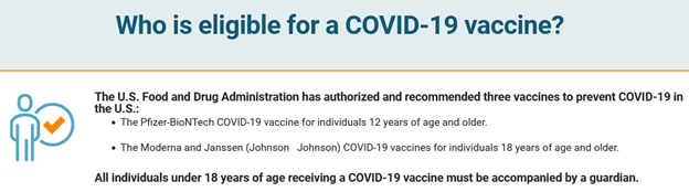 Children aged 5+ are eligible for a series of two Pfizer doses. Booster shots are approved for anyone at least 12 years old who had a second shot of an mRNA vaccine over five months ago or got the Johnson & Johnson vaccine two months ago. Those aged 12–17 are limited to the Pfizer vaccine.