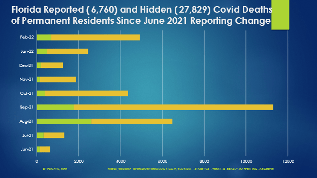 - During June 2021–February 2022, Florida has reported only 6,760 of the 34,589 Covid deaths among permanent residents as “New Deaths” (20%).