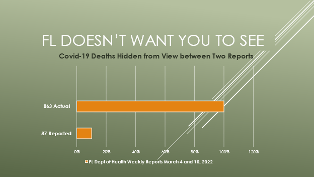 Beginning in June 2021, Florida removed all archived Covid data from their web site. Once a week, they replace the statistics from the previous week with a new report. That makes it difficult for anyone who has not saved the old data to see the actual numbers of cases and deaths. No hospitalization data is included. On the Florida Department of Health web site, you can locate influenza records from 2001 but not Covid data from February 17, 2022.