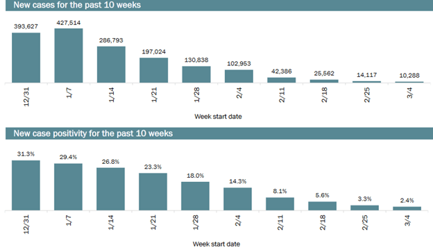 - A 2.4% new case positivity rate means there is enough testing to capture mild and asymptomatic cases. This was a 27% decrease compared to last week.