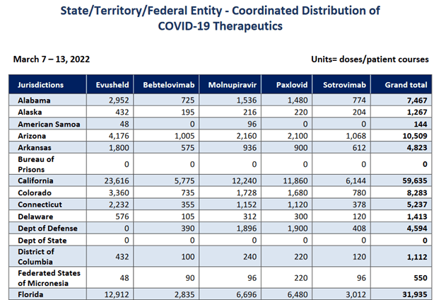 Here is the most recent federal allocation of 32,000 Covid-specific treatments to Florida: