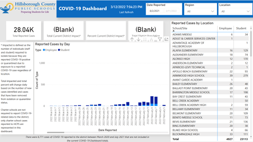 In the Hillsborough County School District, as of March 8, 2022, there have been 28,040 cases during this school year. The 27 cases reported during March 4–10, 2022 constitute a 67% decrease from the previous week (81 during February 18–24, 2022):