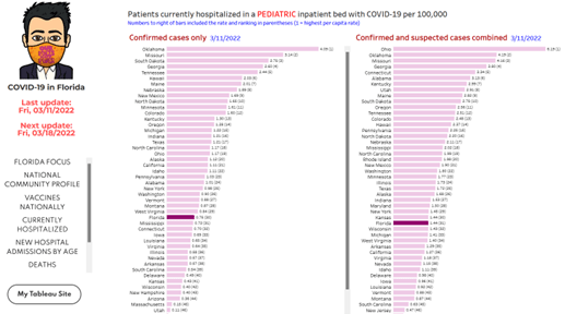 - 32 children were in Florida hospitals, a drop of 30; however, admissions were the same as a week ago at 33/day.