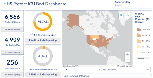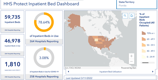 HHS tracks Hospital Utilization. On the morning of March 11, 2022, 79% of hospital beds in Florida were full, the same as last week. Covid patients accounted for 1,810 of them (3% of utilized beds, down from 4%).