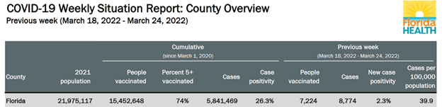 - Florida reported 5,841,469 cumulative Covid cases.