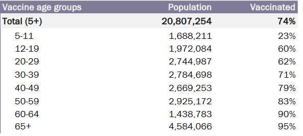 - Only 23% of those aged 5–11 are vaccinated; 60% of adolescents are.