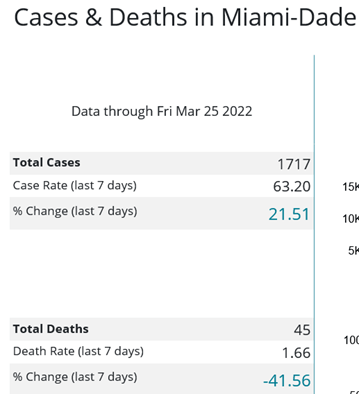 The omicron surge in Florida began in Miami-Dade County. While deaths declined, cases rose 22% over last week, most likely due to omicron BA.2. This was the first increase since January 7th.