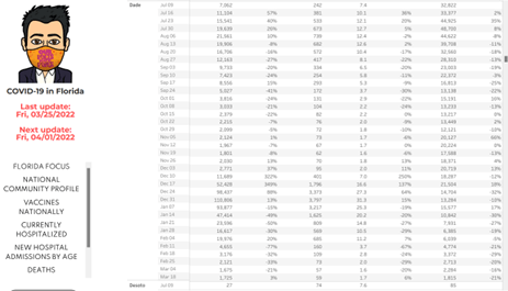 - On March 7, 2022, a discussion panel moderated by Governor DeSantis recommended against Covid vaccination for healthy children due to the risk of adolescent males developing myocarditis. Florida is the only state to make such a declaration.
