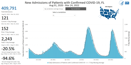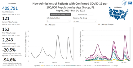 - For August 1, 2020– March 24, 2022, 8.9% of all US Covid hospitalizations were in FL (6.6% of US population). That includes 409,791 people.