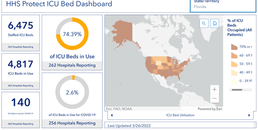 HHS tracks Hospital Utilization. On the morning of March 26, 2022, 78% of hospital beds in Florida were full, the same as last week. Covid patients accounted for 1,155 of them (2% of utilized beds, down from 3% last week).